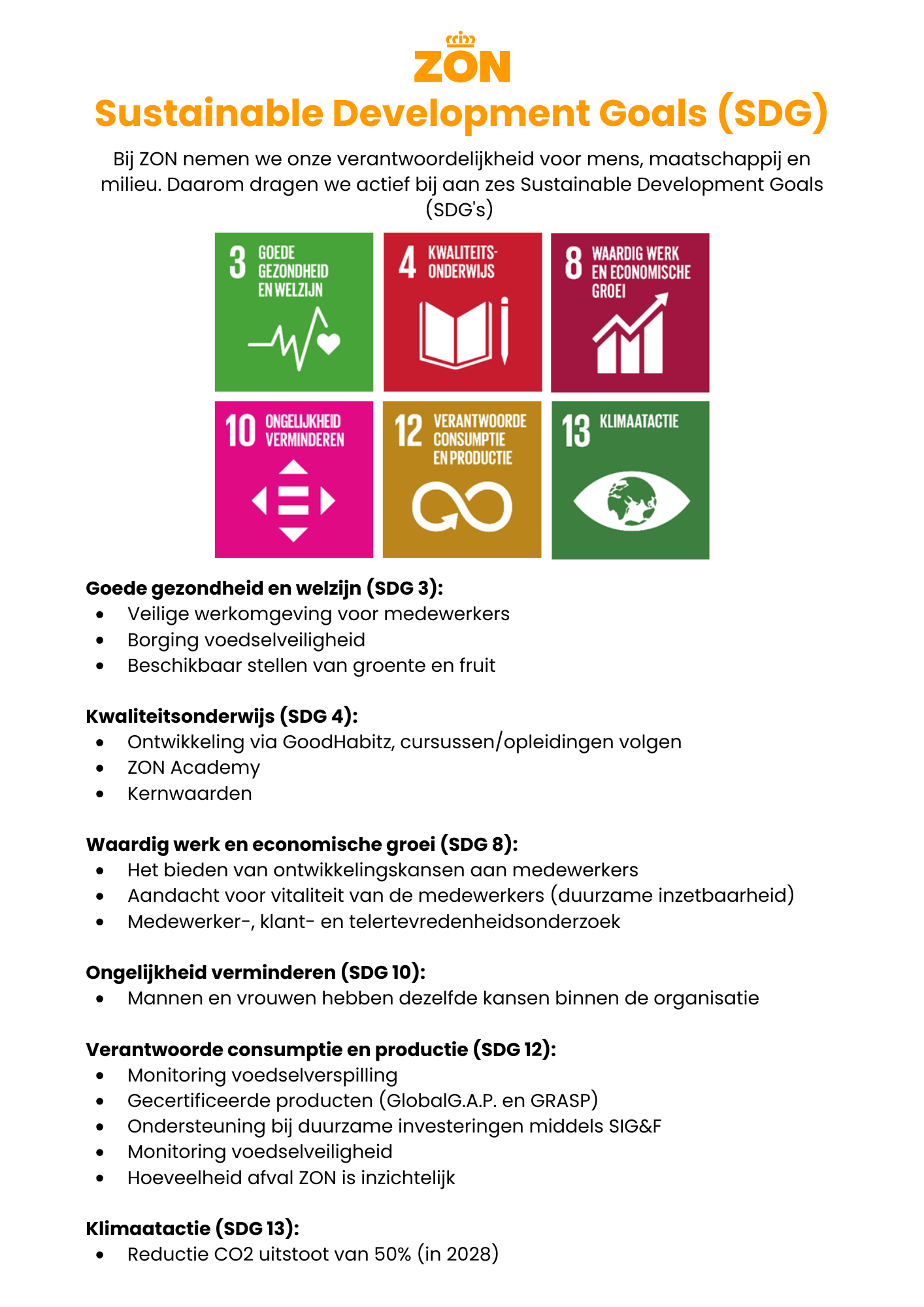 ZON gelooft dat duurzaam geteelde groenten en fruit garant staan voor eten met een goed gevoel. Zo doen de telers van ZON er elke dag alles aan om duurzamer te ondernemen, denk hierbij aan: